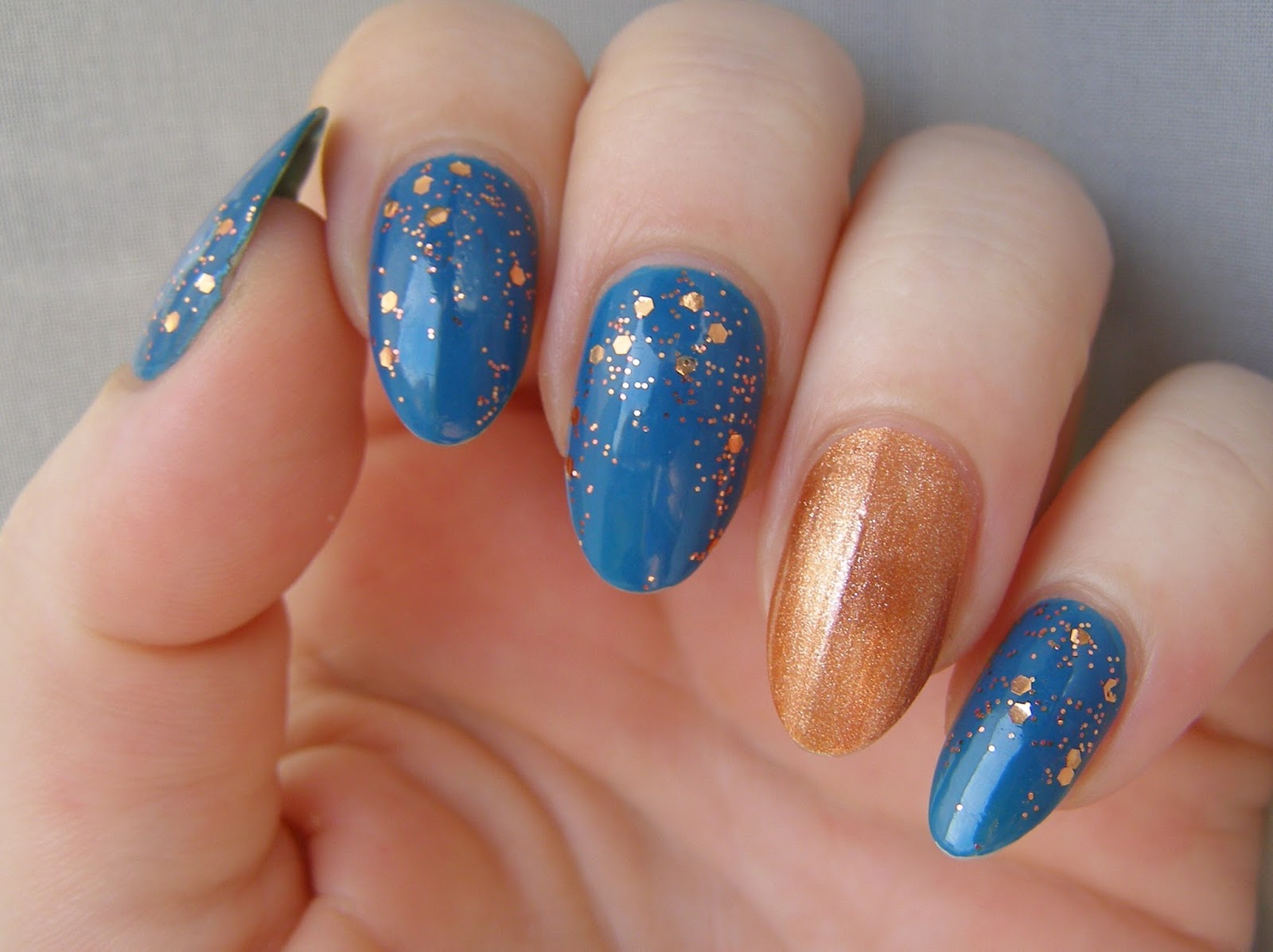 A gyűrűsujjamra a Manhattan Liquid Copper-ből festettem szintén két réteget, a rezes csillámok egy Avon Color Trend körömlakkból kerültek fel a kék alapra.